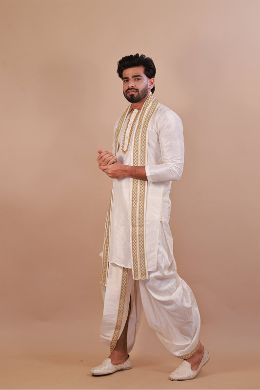 White Kurta Set for Men with Lace Dupatta and Kaccha Pant