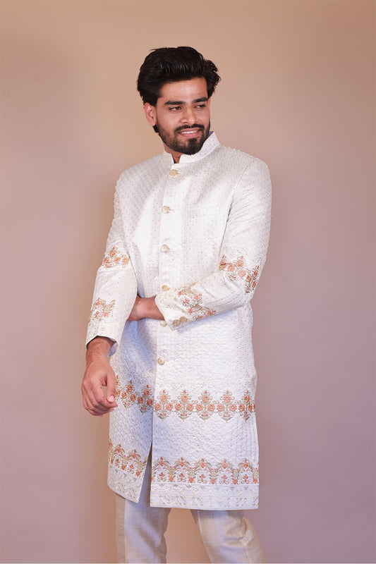 Cream Sherwani with Orange Floral Embroidery - Perfect for Grooms