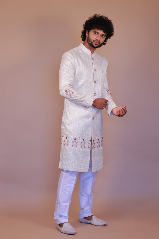 Traditional White Sherwani with Exquisite Thread Embroidery for Groom