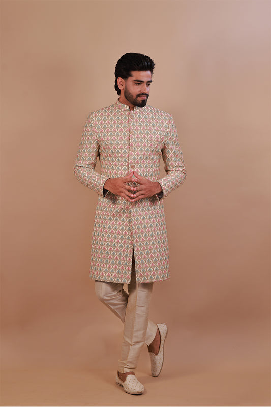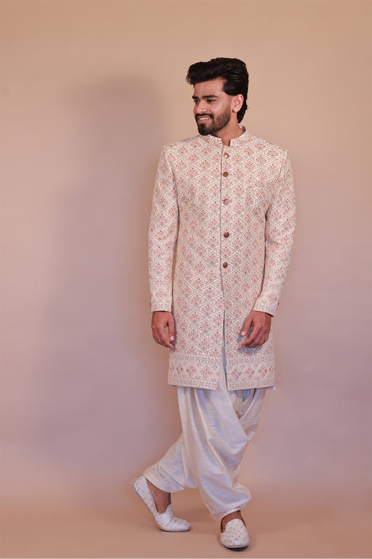 Cream Sherwani with Intricate Pink & Gold Embroidery for Grooms