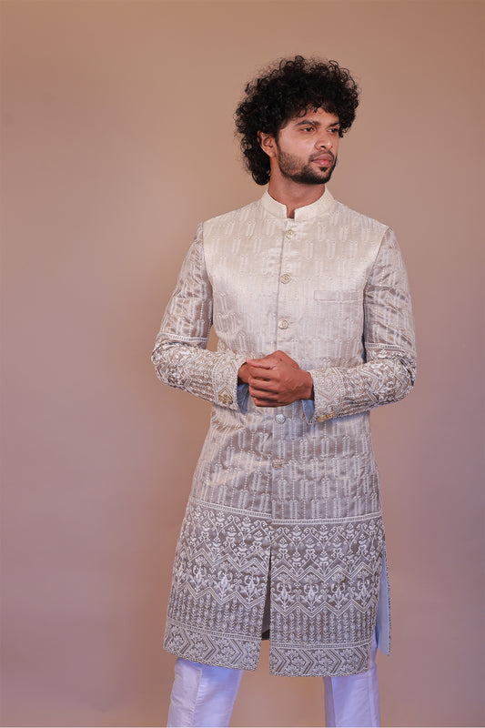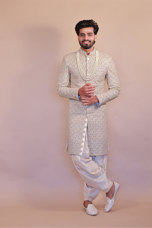 Cream-Grey Sherwani with White Thread Embroidery for Grooms