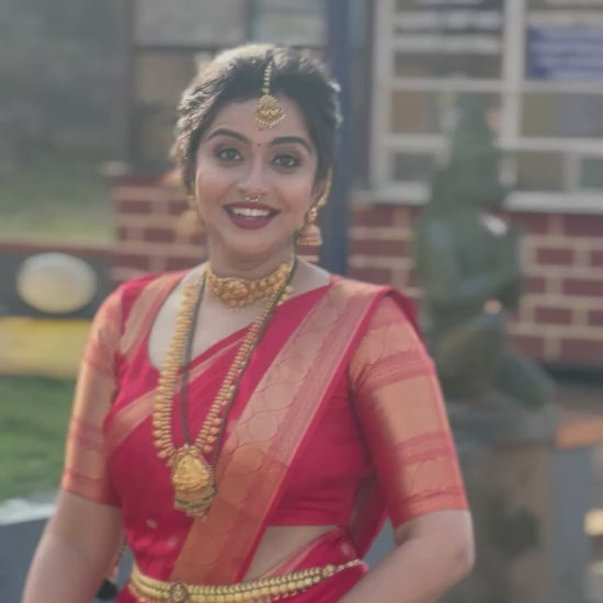 The vibrant red hue symbolizes prosperity and celebration, while the elegant border and subtle motifs add a regal touch. Paired beautifully with traditional jewelry, this saree is perfect for brides, temple visits, and special occasions where tradition meets sophistication.